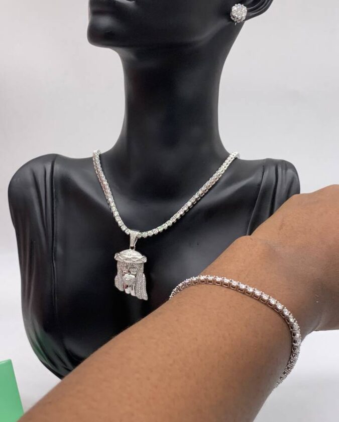 Redefine luxury with this exclusive Unisex Combo Set — a matching collection that speaks to style, unity, and prestige. This all-in-one ensemble includes a necklace, earrings, and a ring, all adorned with high-grade VVS Moissanite diamonds.